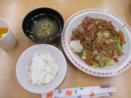 今日のメニューは「ごはん,はるさめスープ,焼きそば」です。焼きそばには野菜がいっぱい入っていて,ボリューム満点です。