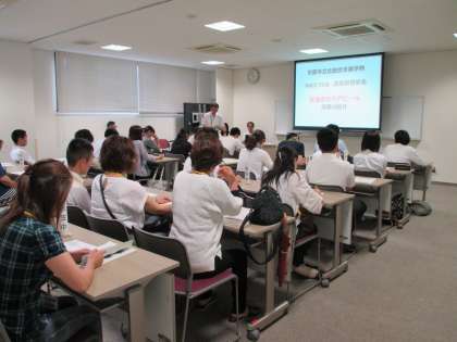 来年度,高等部への入学を検討している北総合支援学校の通学圏域の中学3年生とその保護者を対象に実施しました。生徒とその保護者,学校の先生など,合わせて50名以上の方が来校されました。校内の施設や高等部の授業の見学のあと,本校高等部の教育課程,進路指導についての説明があり,その後質疑応答の時間がありました。高等部の授業については高等部の児童生徒会役員からスライドとともに説明がありました。参加されたみなさんは,メモをとるなどし,真剣な表情で聞いておられました。