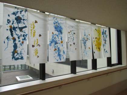 中学部ワーク8班が,校舎A棟の3階に,不織布を使った作品で日差し除けをしてくれました。鮮やかな色が画面いっぱい!よく見ると校内で栽培していたお花の押し花があちこちにちりばめてあります。見た目も涼やかです。来校の際にはぜひご覧ください。