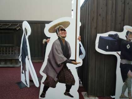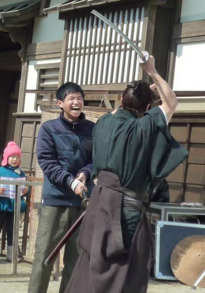 映画村内を散策中にショーに飛び入り参加した生徒もいました!
