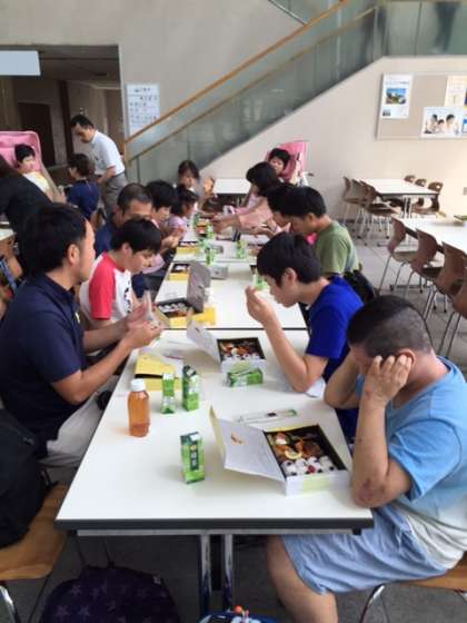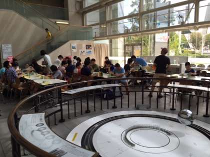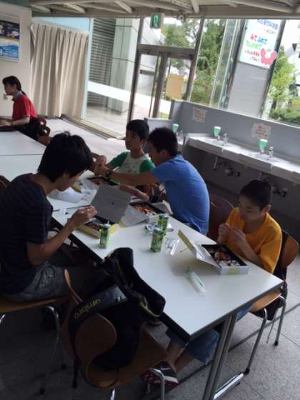 プラネタリウムが終わり、フーコーの振り子が展示してある休憩室でお弁当です。