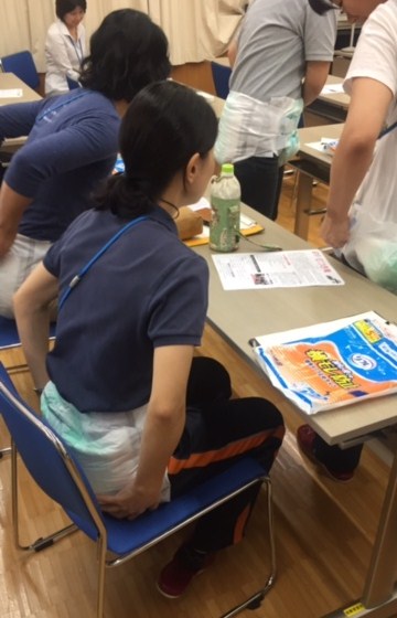 参加教員は配布されたおむつを自分で装着して,研修を受けています。