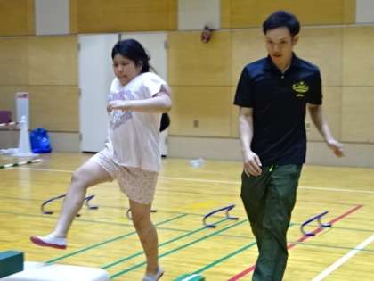 先生もバランスを崩してしまう幅の狭い平均台の上を,勢いよく歩いたり,ハードルの下をとても愛らしい動作で前進したり,跳び箱を越えたり,上に下にと,いろいろな動きを楽しみました。