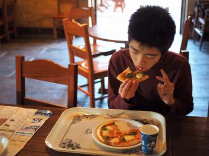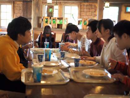 こちらのグループはみんなで楽しくおしゃべりしながら昼食を食べています。メニューも自分で選びました。