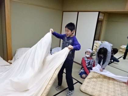 宿泊準備その2…和室の清掃や布団のシーツ掛けの様子です。一人でできること,友達と力を合わせなければできないこと,がわかりましたね。