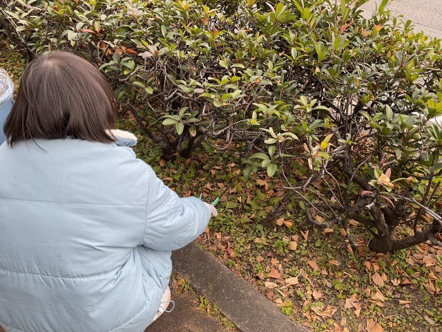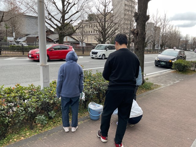ほうきやハサミを使い、正門付近の清掃活動を行いました。ゴミはほとんどなく、落ち葉などを中心に集めました!