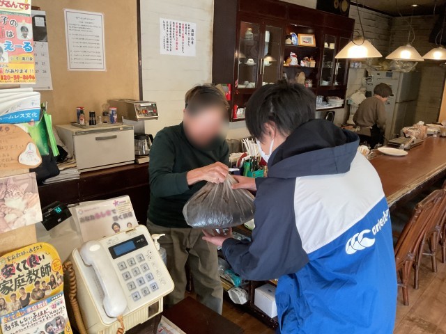 学校の近くのお店の「逃現郷」様、「コーヒーショップべんがら」様へコーヒー豆の出しがらの回収に行ってきました。