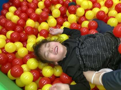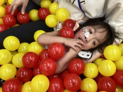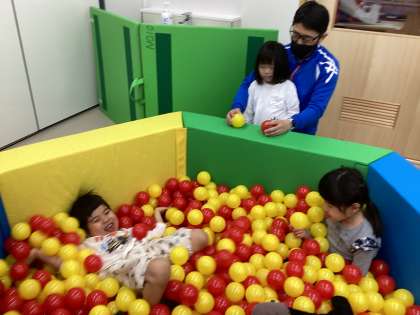 小学部では、プレイルームでボールプールで遊びました。子ども達は笑顔いっぱいで、ボールに触れていました。