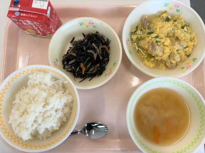 今日の給食は、とり肉とその子どもになる卵を使った「親子煮」です。だしで煮込んだとり肉とふんわりした卵をいっしょに味わって食べましょう。