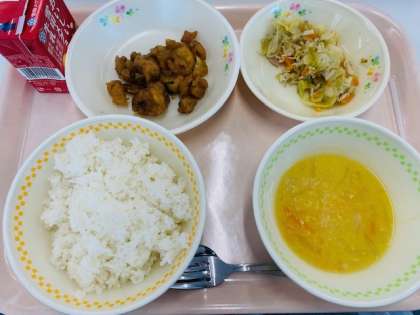 本日の給食 公開日 2024/05/16 更新日 2024/05/16 学校の様子 (5月16日(木)の献立) ・麦ごはん ・油淋鶏(ユーリンチー) ・キャベツとハムの炒め物 ・中華コーンスープ ・牛乳 油淋鶏は中国料理の一つです。 「油淋」は油をかけるという意味ですが、給食では、たくさんの鶏肉を調理するので、衣をつけて油で揚げています。揚げた鶏肉のうまみに足して、ネギの香りや生姜の効いたさっぱりしたソースの香りを楽しみながら美味しく頂きました。