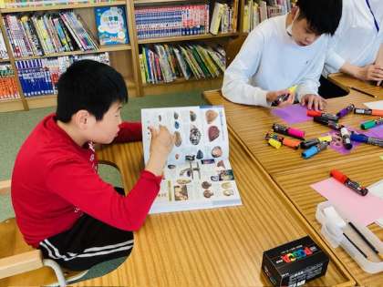 今日は高等部がワークスタディをしている横で、小学部の児童がユニット学習で利用していました。高等部の生徒が「ここでは歩いてね。」と小学部の児童に優しく言葉をかける様子や、ワークスタディで制作活動をしている生徒の隣で、図鑑を広げて読んでいる児童もいて、今日の図書館も子ども達の笑顔と楽しそうな声であふれています。