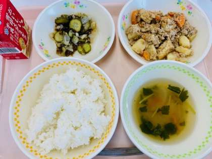 本日の給食 公開日 2024/07/01 更新日 2024/07/01 学校の様子 <7月1日(月)の献立> ・ごはん ・厚揚げのごま味噌そぼろ ・酢のもの ・野菜のさわにわん ・牛乳 ◇食材紹介「きゅうり」 ウリ科の野菜です。 水分が多く、体温を下げる働きがあるので、暑い夏、体温の調節をする のに頼りになる野菜です。 今日の給食は、「酢のもの」に入っています。きゅうりのパリパリした 食感を楽しみましょう。