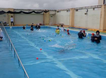 雨予報が続いていましたが、みんなの願いが叶い、本日、水泳学習を実施することができました。少し雨がぱらついていましたが、気にならないぐらいみんな元気にアクアビクスやボール集めを楽しみました。スイムコースではバタ足やクロールなど積極的に泳ぎの練習するなどとても意欲的に活動できました。