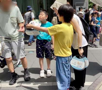 初めは緊張している様子がありましたが、たくさんの方がうちわを受け取ってくださるので、次第に大きな声で「うちわ、いかがですか?」「うちわ、どうですか?」と言葉をかけて手渡すことができました。暑い中でしたが、たくさんのうちわを配り終えた児童生徒は、とても満足そうな表情をしていました。