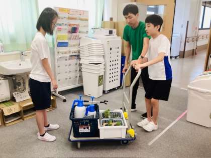 役割&コミュニティの生徒たちが、職員室に9月の給食カレンダーと観葉植物を届けてくれました。観葉植物は一度生徒たちが回収をして、教室で水やりをしてから、職員室に届けてくれています。