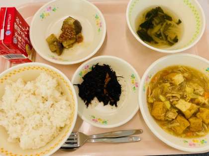 今日の給食の「加茂なすの田楽」は、京の伝統野菜の加茂なすを使って