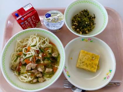 今日の給食の「あんかけうどん」は、昆布と削りぶしでだし