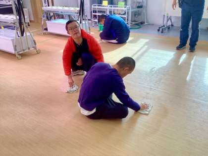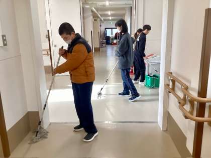 協働ファームの生徒が、校内メンテナンスに取り組んでいました。モップや雑巾を使い、水を切る、廊下や教室の床を拭く、バケツで洗う…という一連の動きをしながら、校舎を綺麗に拭いていました。