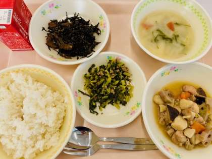 今日の給食は、鶏肉・里芋・れんこん・にんじん・こんにゃく