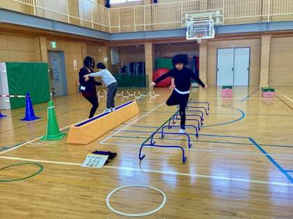もうひとつのユニットでは、跳ぶ、またぐ、渡る、くぐる…などの動きを組み合わせたサーキットに取り組んでいました。