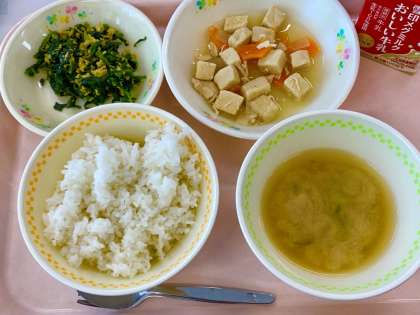 本日の給食 公開日 2025/04/14 更新日 2025/04/14 学校の様子 4月14日(月)の献立 ・麦ごはん ・ほうれん草とたまごの炒め物 ・こうやどうふと野菜の煮つけ ・ じゃがいものみそ汁 ・牛乳 ◇毎日見よう!給食カレンダー◇ ●献立の名前、盛り付け方、並べ方がわかります ●献立のこと、料理のこと、栄養のこと、行事と食べ物のことが わかります ●どんな食べ物が使われているかがわかります 「給食が楽しみになりますよ」