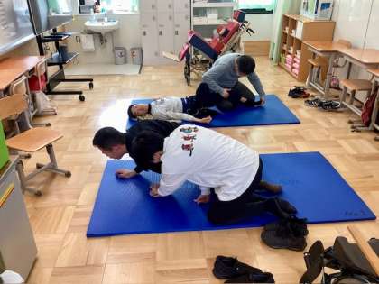 各教室ではそれぞれの課題に応じて、ストレッチをしたり、膝立ちや座位姿勢の保持、階段昇降などに取り組んでいました。