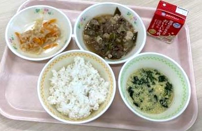 今日の給食では、牛肉を炒め、料理酒、砂糖、しょうゆを加えて味