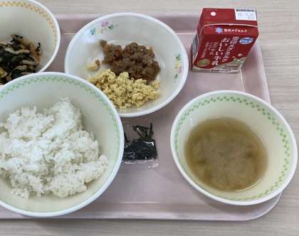 ツナと玉ねぎ、にんじんを甘辛く炒め煮にした丼の具です。給食では自分たちで『ツナそぼろ丼の具』をごはんの上にのせていただきます。きざみのりをのせると、よりいっそうおいしくなります。