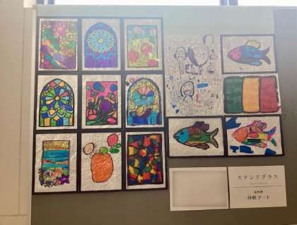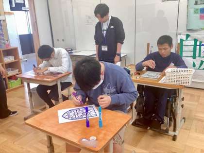 高等部ライフスタディの学習の様子です。「分校アート」では、マジックペンで塗ったクリアファイルに、くしゃくしゃとしたアルミホイルを挟んで、ステンドグラスを制作しました。色鮮やかで、それぞれの個性が光るステンドグラスになりました。