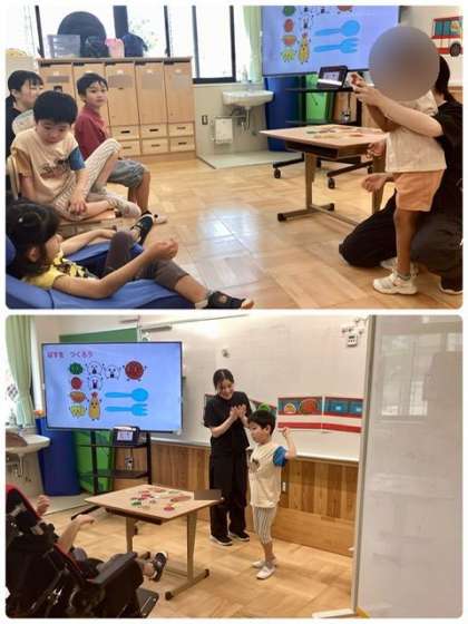 小学部1年生では、「おべんとうばす」のお話遊びをしました。お弁当に入れるおかずや具を見て名前を言ったり、好きなものを選んだり、「おべんとう」の歌を歌ったりしました。「おべんとう」の歌が好きで、もっと聴きたいな…と表情で伝える様子や、「ばす」に好きなおかずを貼り付けて、得意げな様子も見られました。