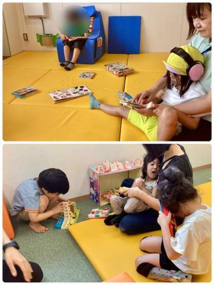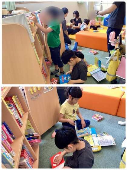 図書館に行き、音の鳴る絵本や感触を楽しめる絵本など、それぞれが好きな絵本を探して選びました。耳にあてて音楽を楽しんだり、スイッチを押して自分の好きな音楽を聴いたりしていました。