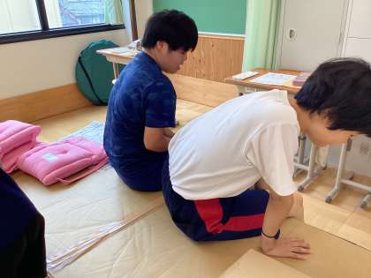 高等部のユニットで防災教育に取り組んでいます。今回は下京区役所地域力推進室の皆様にご協力いただき、段ボールベッドと簡易トイレをお借りし、実際に生徒たちで組み立てし、使い勝手を試す学習に取り組みました。