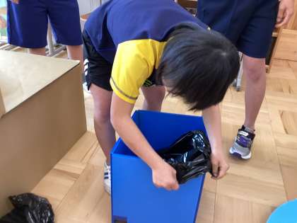 はじめに段ボールベッドの組み立てをしました。生徒たちは協力しながら組み立てし、実際に寝てみたり、座ったりして、頑丈さを体感しました。次に簡易トイレを組み立てました。段ボールに黒ビニール袋をかぶせ蓋をしたら完成です。さらに水分を凝固剤で固めることも試しました。生徒たちは興味津々に取り組んでいました。その姿は頼もしく感じました。
