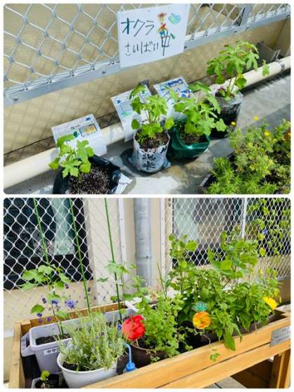・中学部で育てているオクラやハーブも、暑さに負けずに成長しています。ラベンダーはまた花を咲かせていました。