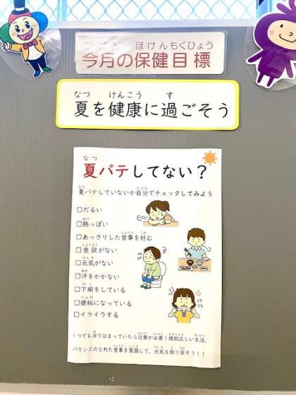 8月 今月の保健目標〜夏を健康に過ごそう〜 公開日 2025/08/27 更新日 2025/08/27 学校の様子 今月の保健目標は「夏を健康に過ごそう」です。 まだまだ暑い日が続きますので、夏バテしていないかをチェックをして、元気を取り戻しましょう。