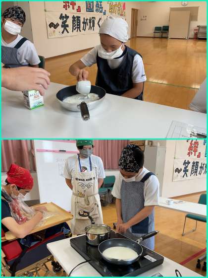 手順書に従って材料を計量して混ぜ合わせたり、IHクッキングヒーターの電源を入れて熱した素材を器に入れたりして、プリンを作りました。事前学習で行なった後片付けまで、安全に、そして適切に道具を使って取り組むことができました。