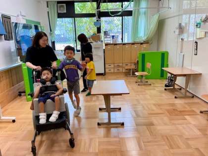 午後の時間、音楽遊びの様子です。音楽に合わせて、友だちや指導者と歌ったり、電車ごっこで一緒に歩いたり…いい表情で活動していました。