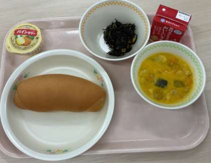 給食にはいろいろな種類のパンが登場します。みなさんの大好きなパンには、どんな材料がつかわれているのしょうか。。ひとつは、小麦粉です。そしてこの小麦粉をふくらませるためにイーストというパン酵母菌をつかいます。これに水、砂糖、塩などを加えてこね、発酵させてかたちを作り、焼いたものがパンになります。