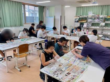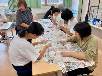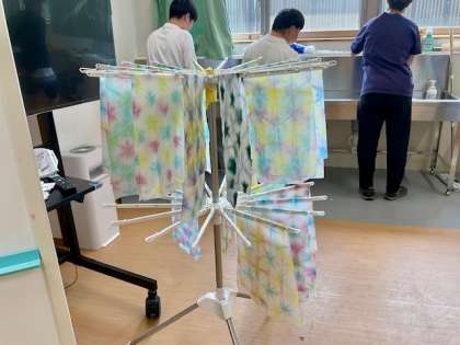 高等部 ワークスタディの様子 公開日 2025/09/10 更新日 2025/09/10 高等部 高等部ワークスタディ「染め織り」班の様子です。 染め織り班では紙をたたみ、それを染料で染める作業に取り組んでいました。紙が染料を吸い上げることで模様がつき、さまざまな模様の紙が出来上がっていました。