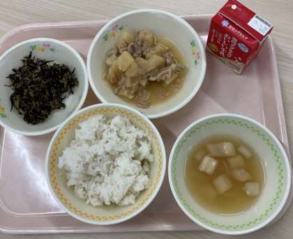 明治時代にイギリスの「ビーフシチュー」を作ってみようとしましたが、バターやワインといった調味料が無かったので砂糖としょう油を使いました。するととてもいおいしい料理が出来上がりました。これが「肉じゃが」の始まりと言われています。給食には、「しょうゆ味」「みそ味」「ピリ辛みそ味」「カレー味」の肉じゃがあります。今日は、赤みそと信州みそを使った肉じゃが(みそ味)です。