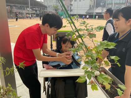 中学部 ライフスタディの様子 公開日 2025/10/14 更新日 2025/10/14 中学部 中学部ライフスタディの様子です。 育てていた綿花を収穫しました!写真のような、茶色と白色の2種類の綿花です。ハサミで切り取って収穫した後は、フワフワした感触を味わいました。