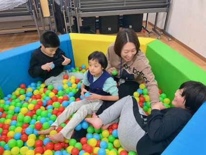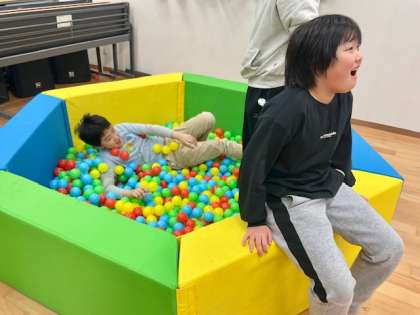 ボールプールではボールを渡し合ったり、相手に投げたり…という活動やトランポリンではダイナミックに身体を動かして活動していました。光遊びでは、思い思いにリラックスできる体勢で天井の光を眺めたり、ヨガポーズをしたりしていました。