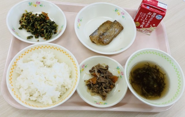 大根は、根と葉で含まれる栄養素が異なります。普段よく見る白い根のび部分には、「ビタミンC」がたくさん含まれています。ビタミンCには体の調子を整える働きがあります。今日の給食の大根葉とにんじんのごま油炒め」に使われている大根葉は、葉の部分です。「ビタミンC」に加え「カロテン」「カルシウム」も豊富にひ含まれています。カロテンには粘膜を強くする働き、カルシウムには骨や歯を強くする働きがあります。今日の給食は、胡麻油で炒めることで風味が増しています。