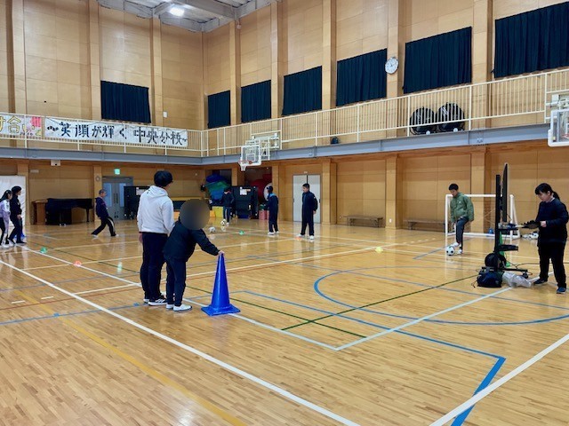 中学部ライフスタディ「身体を動かそう」の学習の様子です。体育館のユニットグループでは、2人ペアになってサッカーボールを「足で止める」「相手にパスする」、また輪になってパスやカットをする…といった活動をしました。初めは足よりも止めやすい手を使う姿がありましたが、指導者の手をつなぐ支援や活動を繰り返す中で次第に足で止める動きに慣れる様子が見られました。また、相手へのパスは柔らかく、足で止めやすいように蹴る様子も見られ、パスが何度も続くペアもたくさんいました。