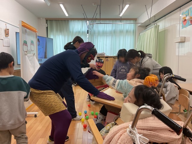 今日は節分です。鬼(災い)を追払い福を呼ぶ豆まきが校内のいろんなところで行われていました。この写真は小学部から依頼を受けた鬼がやってきました。鬼は「みんなを驚かせすぎないように,慎重に慎重に」廊下から様子を伺っていますが,教室内から鬼を見つけた児童が駆け寄ってきました。最後は鬼とみんなで仲良くなることができました。みんなの為に頑張ってくれたこの鬼は一体誰でしょう。