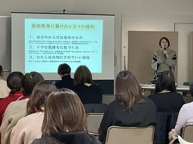 講師には、株式会社PLATICA代表取締役、京都あいこ助産院院長渡邉安衣子様をお招きし、子どもたちの性教育を、人権の視点を踏まえわかりやすくお話していただきました。初めの参加者からのアンケートをもとに、参加者の知りたいこと聞きたいことに副った話を、具体的にポジティブに説明してくださいました。参加者同士で意見交換する時間も盛り込まれ、会場は和気あいあいとした雰囲気に包まれました。大変貴重なお話をいただくよい機会となりました。講師の渡邉安衣子様、ありがとうございました!