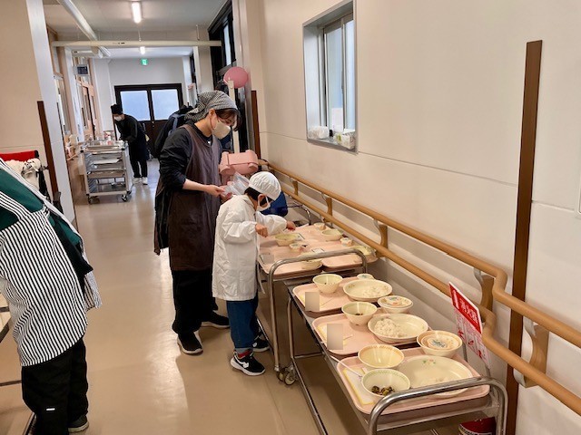 小学部 給食準備の様子 公開日 2026/03/12 更新日 2026/03/12 小学部 小学部の給食準備の様子です。 係を決めて、ストロー、スプーンやフォークなどを配ったり、おかずを人数分よそって配膳したりと、慣れた様子でテキパキと取り組んでいました。量を見ながら人数分を均等によそうこともとても上手で、さすが高学年!この一年間、日々取り組んできたことが、しっかり子どもたちの力になっていることを感じました。