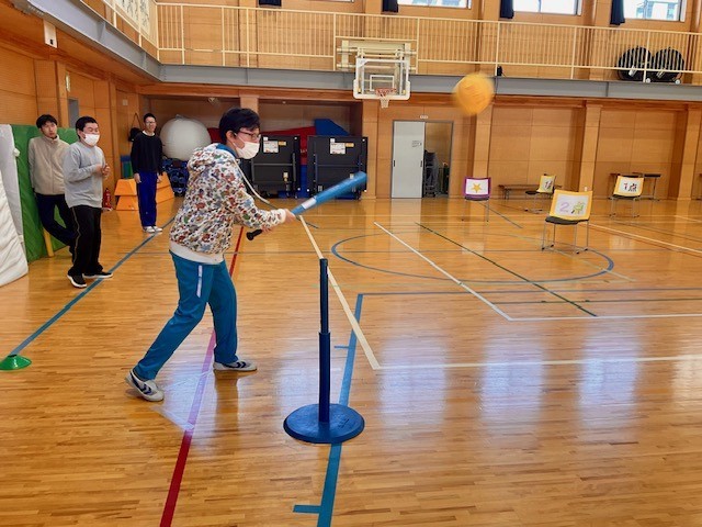 体育館で活動しているグループでは、野球をしていました。椅子やフェンスを使って点数や「アウト」などを表示し、それらをねらってボールをうつ様子が見られました。生徒はコンパクトにバットを振り、うまくボールを前に飛ばしていました。「好きな野球選手は大谷選手!」の宣言通り、大谷選手さながらにかっ飛ばしている生徒もいました。