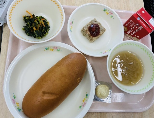 新しい学年になって今日で3回目の給食です。今日の給食はお祝いの気持ちを込めて、手作りの「ミートローフ」しました。鶏肉と豚肉を使い、玉ねぎはコクを出すためにきつね色になるまで炒めました。にんじんと三度豆を入れて彩りをよくしています。ソースも手作りです。みんなで仲良く、楽しく食べてください。