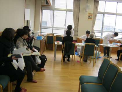 手浴を実施中!並んでいただいてます。(写真 中)